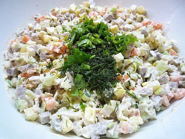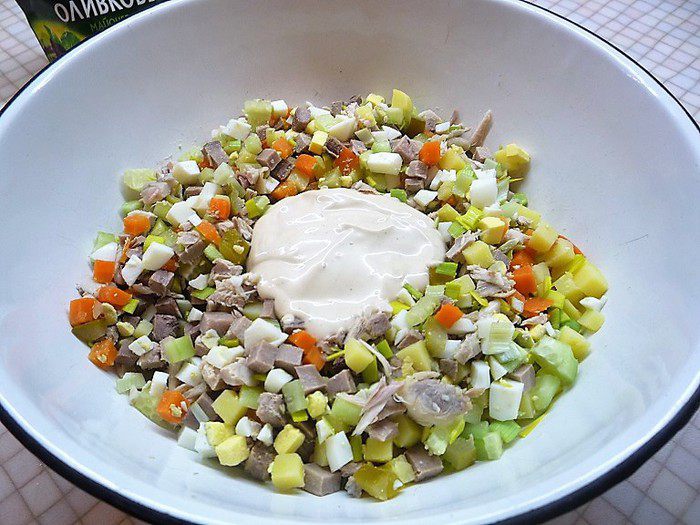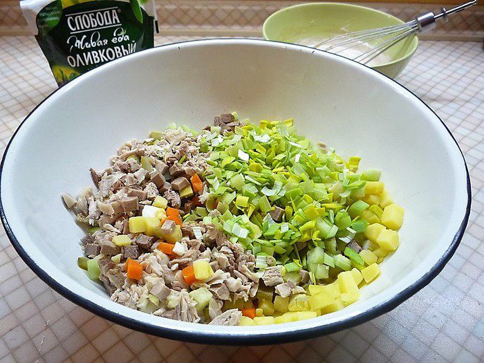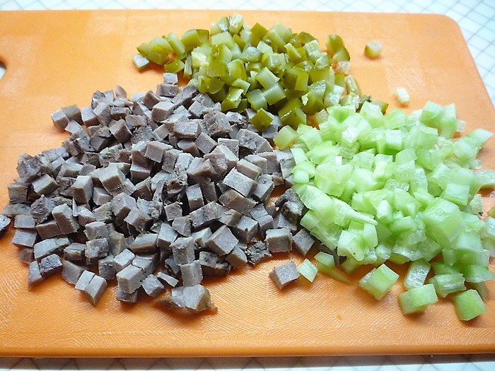 Свиной язык, свежий и маринованные огурцы также нарезаем маленькими кубиками.