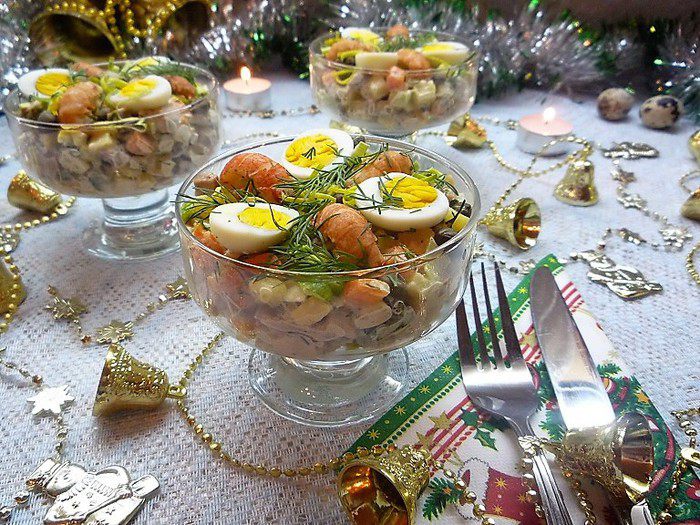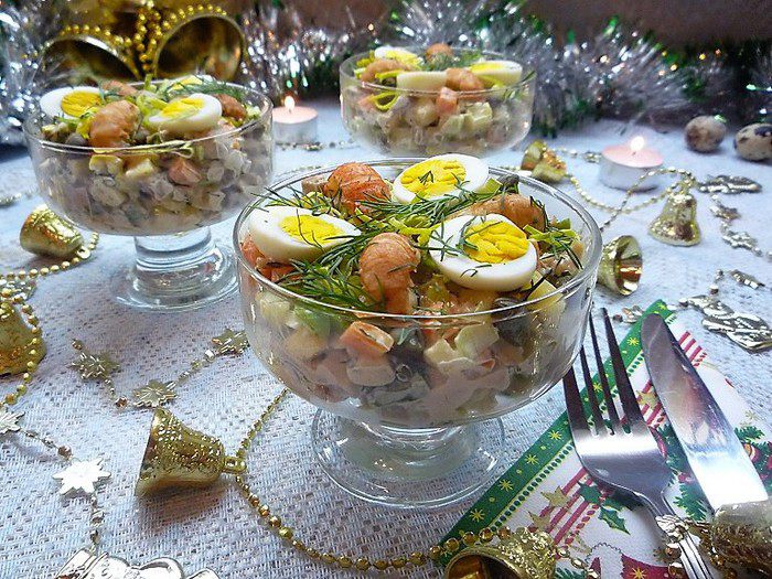 Укладываем салат в порционные салатники, украшаем раковыми шейками, перепелиными яйцами и веточками укропа.