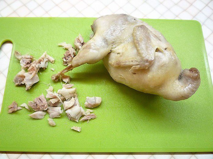 С перепелки снимаем мясо и также мелко нарезаем.