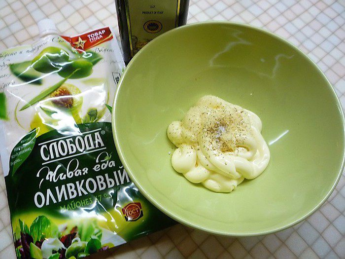 Для соуса в чашку кладем майонез ТМ «Слобода» оливковый, добавляем винный уксус, дижонскую горчицу, морскую соль, перец душистый молотый.