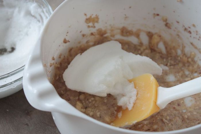 Взбейте белки до твердых пиков и аккуратно перемешайте вместе с банановым пюре, чтобы они не потеряли свою пышность. Для этого добавляйте их в пюре в несколько заходов, каждый раз аккуратно вымешивая смесь от середины к краям.