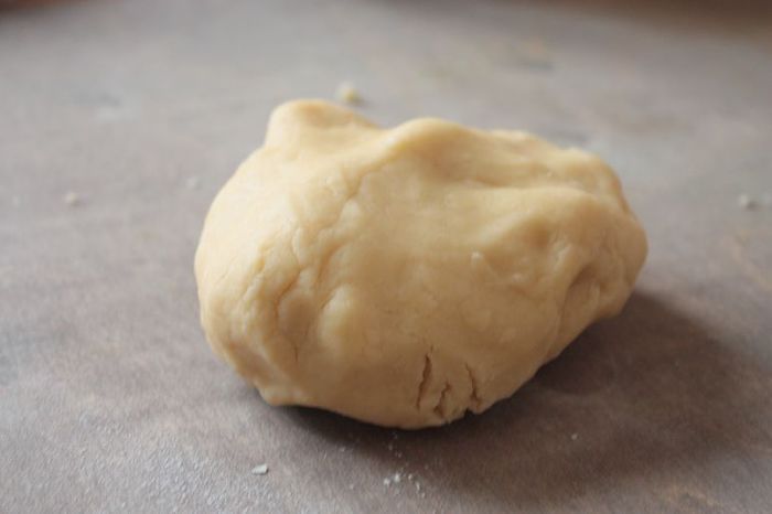 Просейте муку вместе с солью и быстро замесите песочное тесто, чтобы масло не успело слишком сильно нагреться от рук. Вымешивать тесто не нужно! Оберните его пищевой пленкой и отправьте в холодильник на полчаса.