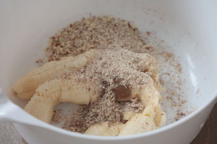 Разомните бананы до состояния однородного пюре с корицей, миндалем и сахаром.