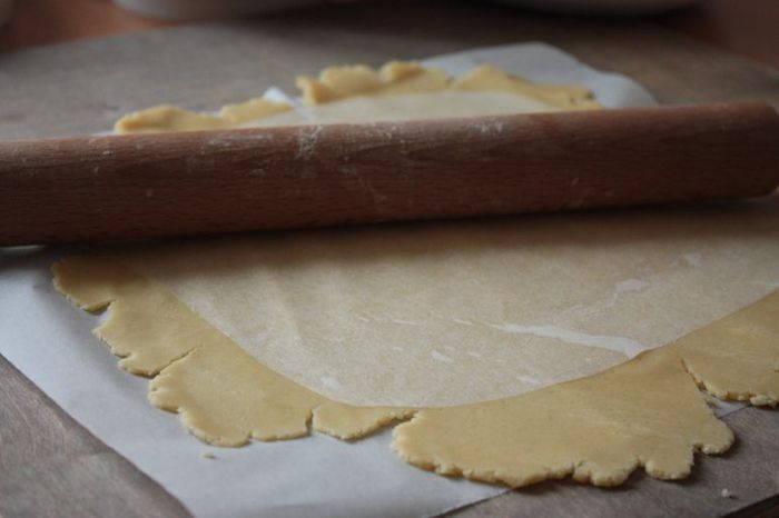 Раскатайте тесто между двумя листами бумаги для выпечки. Выложите тесто в форму для выпекания и сделайте бортики (я выкладываю прямо вместе с бумагой, на которой оно раскатывалось).