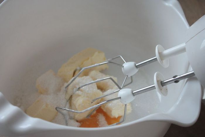 Сливочное масло достаньте из холодильника за полчаса до приготовления, чтобы оно стало мягким. Взбейте его вместе с сахаром и яичными желтками.