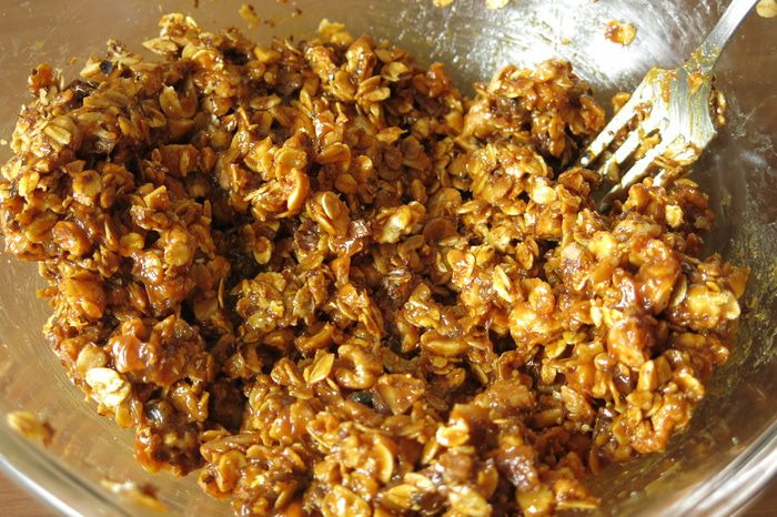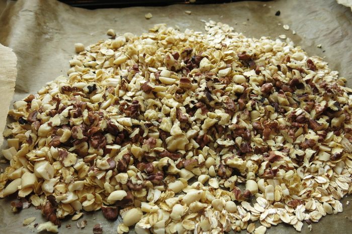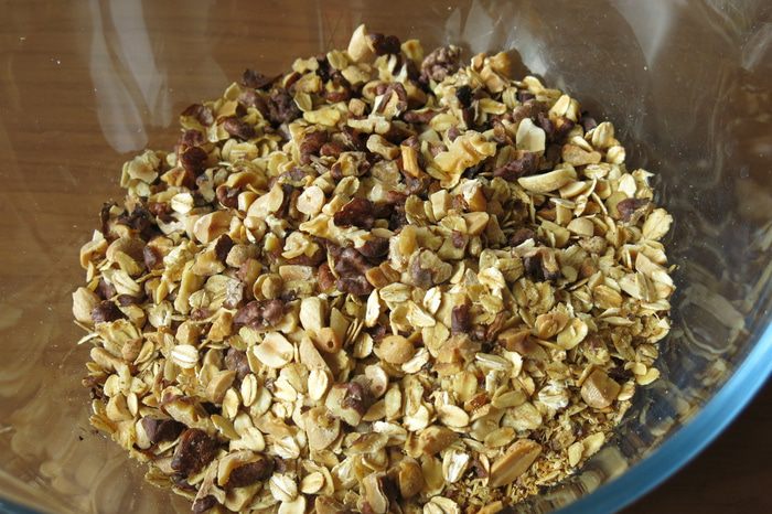Выкладываем хлопья с орехами в миску, даем остыть.