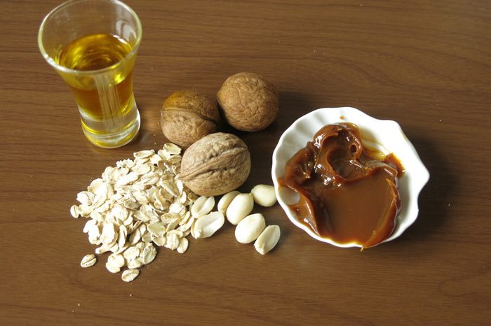 Подготовим хлопья не быстрого приготовления, орехи грецкие, арахис, масло грецкого ореха Biolio, сгущенное вареное молоко.