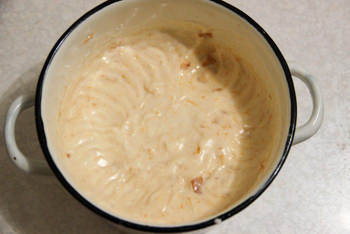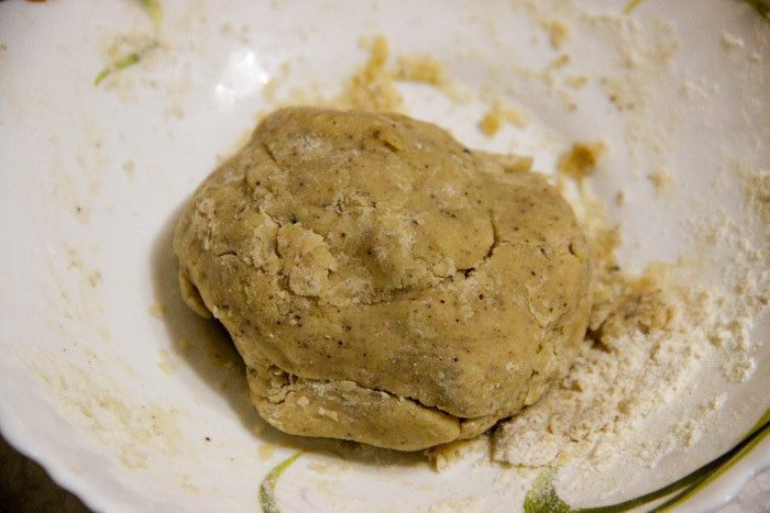 Добавляем муку, замешиваем плотное тесто. Дадим ему «отдохнуть» в холодильнике час (обязательно накроем пищевой пленкой).