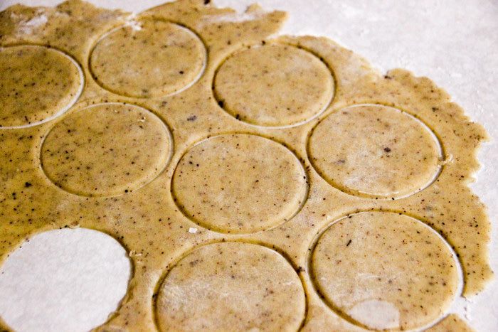 Раскатываем тесто в тонкий пласт, выдавливаем круги. Они должны быть не слишком маленькими. Я для этого использовала чайный бокал.