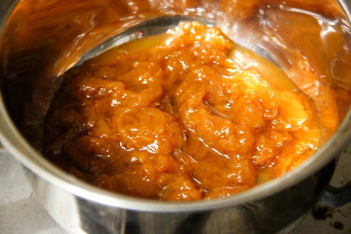 Абрикосовое варенье (у меня оно домашнее) разогреваем на среднем огне, тщательно перемешиваем, чтобы масса стала однородной.