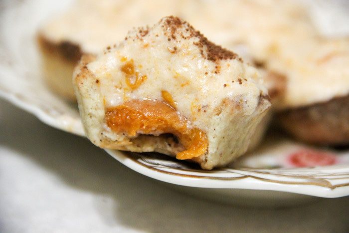 Суфле выкладываем в кондитерский мешок и отсаживаем поверх абрикосов шапочки. К сожалению, кондитерского мешка у меня нет, пришлось пользоваться сподручными средствами, но с его помощью шапочки должны получиться аккуратнее.