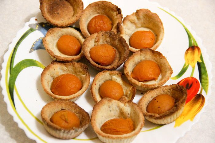 В остывшие корзиночки сначала выкладываем консервированные абрикосы.