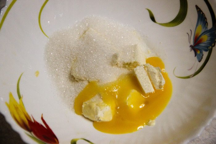 Сливочное масло нарезаем кубиками. Добавляем сахар, один желток (белок припасем для суфле).