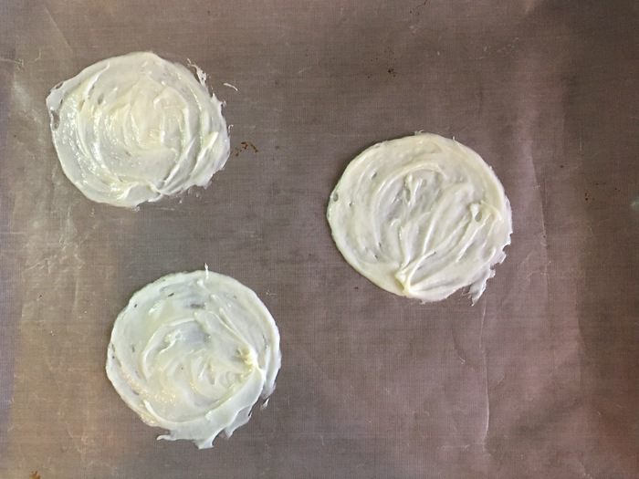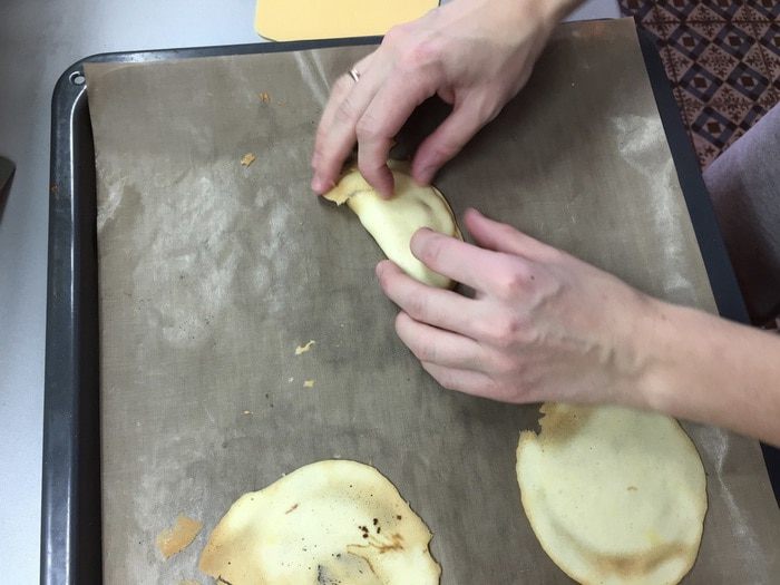 Разогреть духовку до 170°С. Постелить на противень силиконовый коврик (бумага тоже сойдет, но будет труднее, как мне кажется). Берем столовую ложку теста и нежно круговыми движениями размазываем по коврику. Круги должны быть диаметром сантиметров 10 и как можно более тонкими. Ставим в духовку на 6 — 7 минут. Поглядываем. Как только край чуть зарумянился — сразу достаем. И дальше действовать надо будет очень быстро.