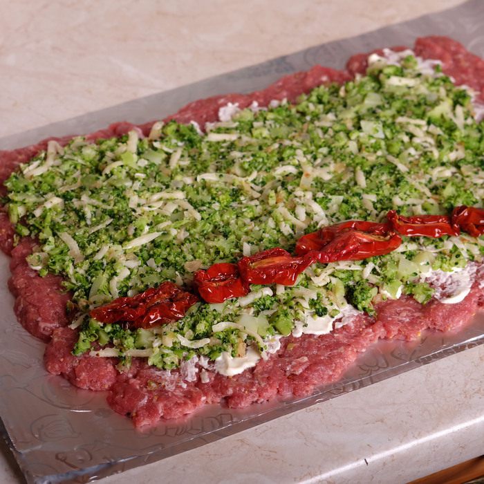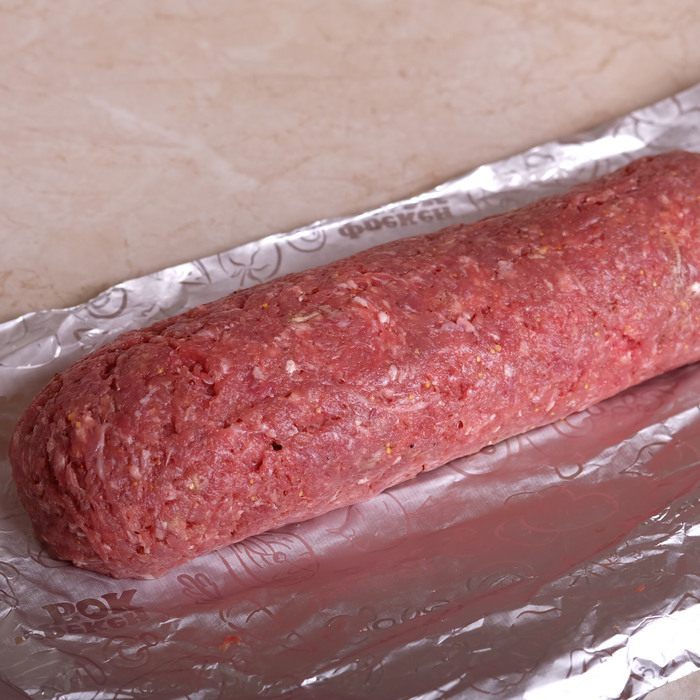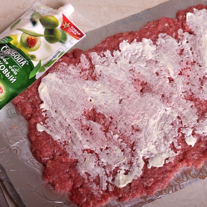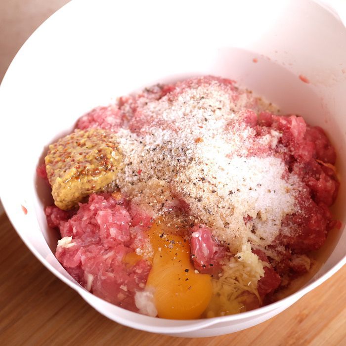 Приготовим фарш. Для этого смешиваем вместе мясной фарш, яйцо, зернистую горчицу, натертый на мелкую терку зубчик чеснока, панировочные сухари, соль и перец по вкусу. Очень хорошо вымешиваем.