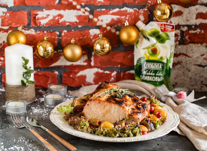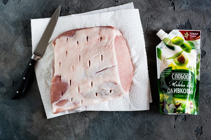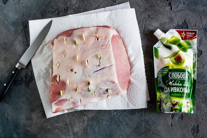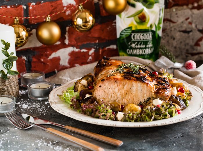Свиная вырезка или корейка даже менее калорийна, чем похожие говяжьи части. При запекании свинина довольно быстро теряет жир и может пересохнуть, поэтому не срезайте слишком много жира с верхней части корейки, а сделайте надрезы, и тогда при запекании мясо будет подпитываться естественным соком. А с маринадом на основе майонеза ТМ «Слобода» Оливковый мясо выходит особенно деликатным, нежным и удивительно сочным.