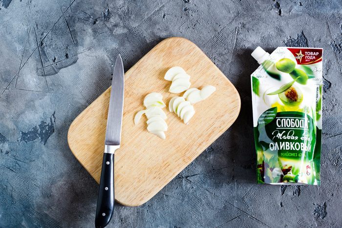 Чеснок очистите и 3 дольки тонко нарежьте, а остальные раздавите плоской стороной ножа.