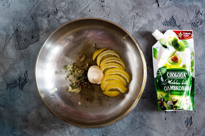 Лимон нарежьте крупными дольками. В глубокой миске соедините резаный лимон, выжмите из него сок, затем добавьте раздавленный чеснок, листочки тимьяна, соль, перец и майонез. Хорошо перемешайте.