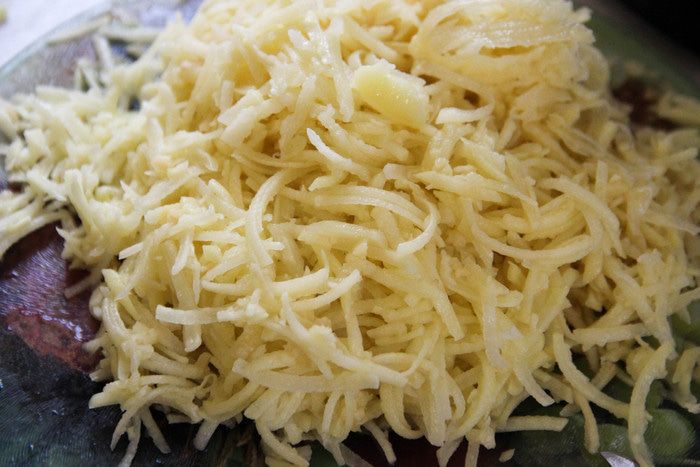 А теперь натираем картофель. Лучше не делать этого заранее, чтобы он не потемнел. Добавляем его к заготовке. Солим по вкусу.