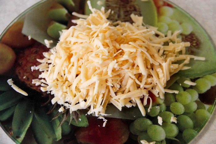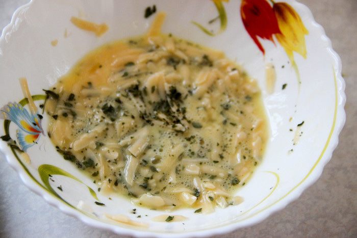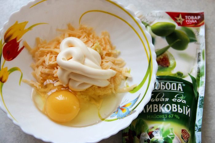 Одну половину сыра смешиваем с измельченным чесноком, яйцом и майонезом. Это основная заготовка для запеканки.