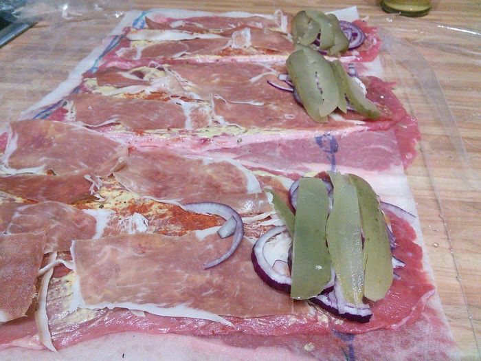 Выложить ролады ветчиной (в идеале пармской или схожей ветчиной очень тонкой нарезки, но подойдет также и сырокопченый бекон).