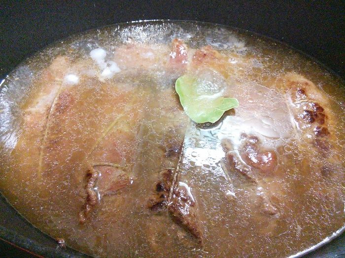 Влить говяжий бульон (у меня часто для таких случаев есть бульон в заморозке), положить в сотейник лавровый лист и запекать в заранее разогретой до 180°С духовке 1,5 часа.