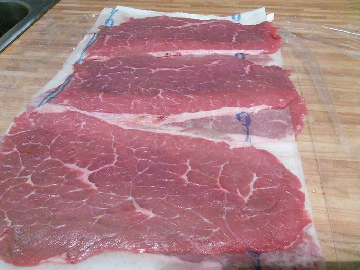 Для ролад подходит говяжья мякоть (огузок), нарезанная тонкими шайбами. Если воспользоваться услугами вашего знакомого мясника, то мясо и отбивать не понадобится. Мясо нужно обмыть и обсушить салфеткой.
