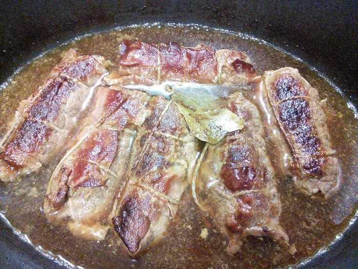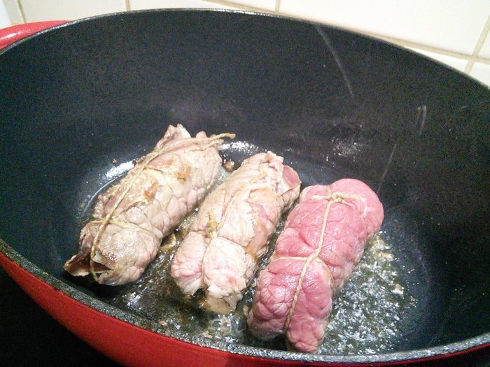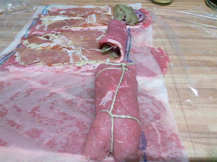 Закрутить мясо в рулеты, концы подгинать не обязательно, зато необходимо связать ролады пищевой ниткой.