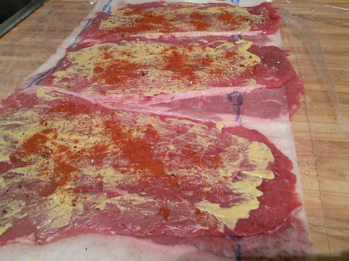 Смазать горчицей, посолить и поперчить, посыпать порошком сладкой паприки.