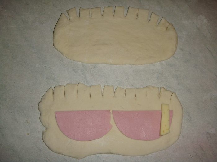 Колбасу тонко нарезать кружочками и пополам. Сыр нарезать брусочками. Каждый шарик раскатать в прямоугольник, сделать надрезы ножом с одной стороны (1 см). Положить кусочек колбасы. С одного края положить 1 брусочек сыра. Начать сворачивать тесто в рулетик с той стороны, где лежит сыр.