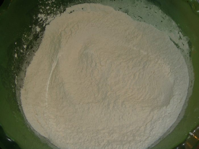 В миску просеять 4 стакана муки, добавить дрожжи и перемешать.