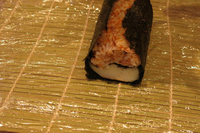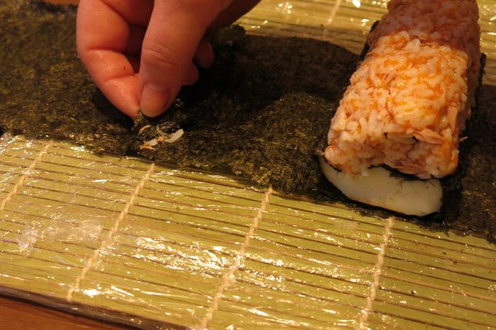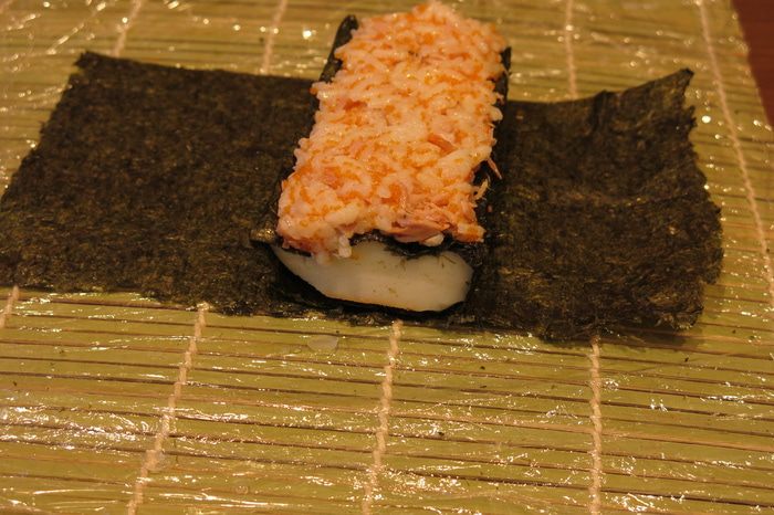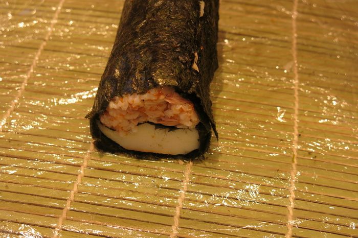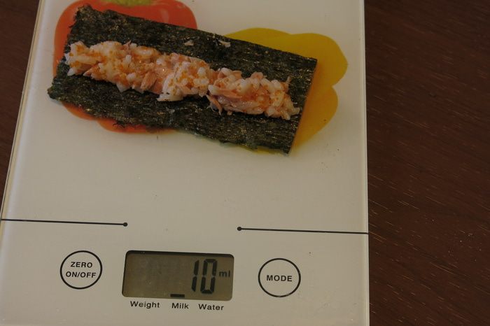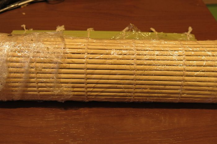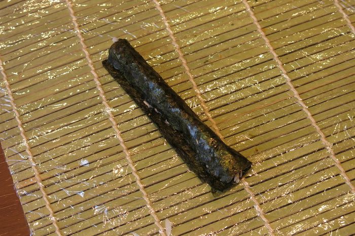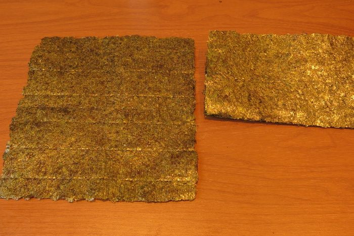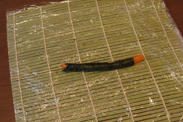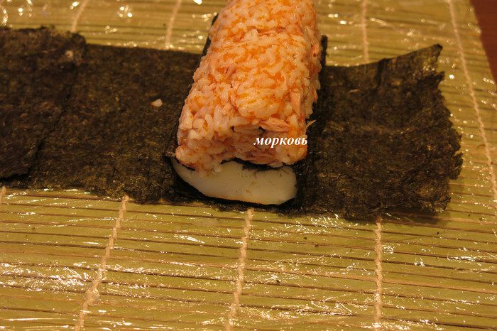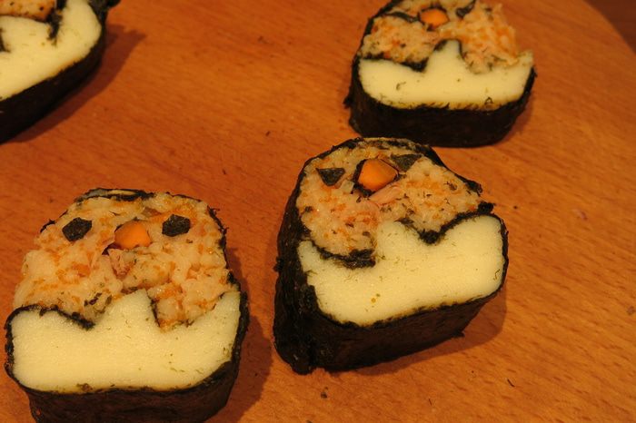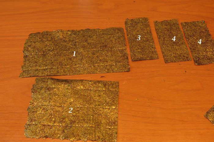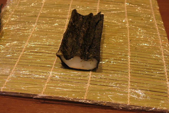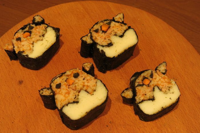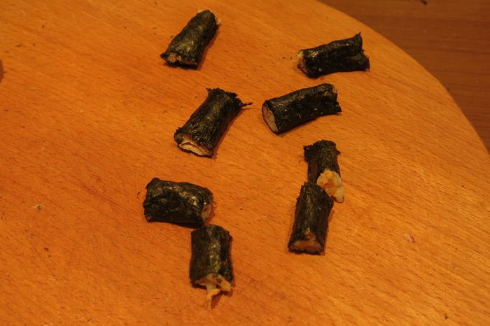 Картинку без описания кадзари-цыпленок увидела в интернете, подобрала очередность сборки, а потом случайно нашла и пошаговое. Для цыпленка используем два листа нори. Каждый из них разрезаем пополам, высота — 21 см, длина — 19 см, т е. при разрезании получается полоски по 10,5 см высотой.