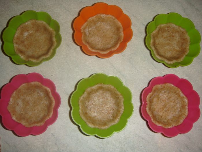 Выложить тесто в формочки и примять пальцами ко дну и стенкам. Дно наколоть вилкой.