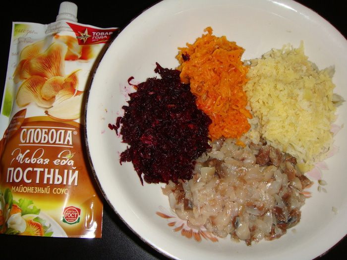 Картофель, морковь и свеклу отварить, остудить и натереть на средней терке. Из соленой скумбрии удалить кости и мелко нарезать.