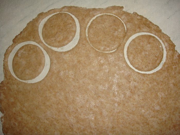 Стол смазать подсолнечным маслом. Раскатать тесто в тонкий пласт. Вырезать кружки размером с формочки для тарталеток.