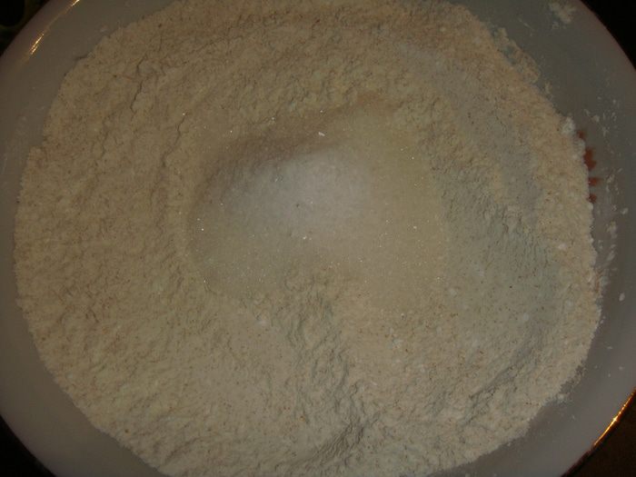 Муку в/с, муку цельнозерновую, крахмал и разрыхлитель смешать.