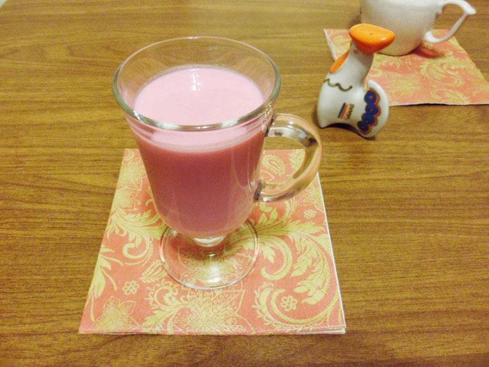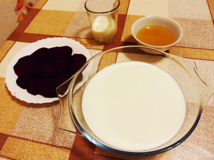 Свеклу (самую небольшую) вымыть, почистить и нарезать тонкими кружочками. Молоко немного подогреть (40°С, не более). Затем молоко влить в стеклянную или керамическую посуду.