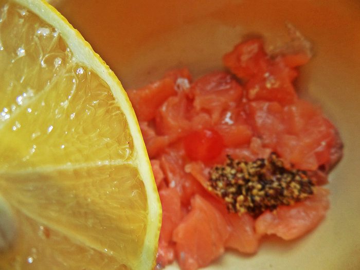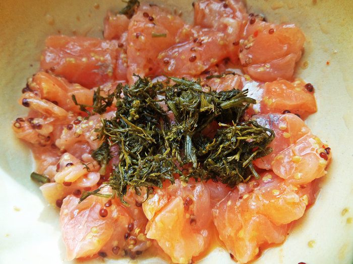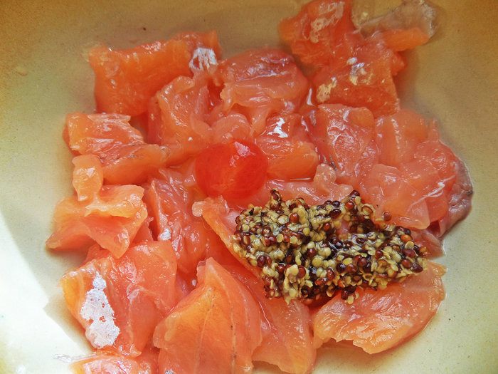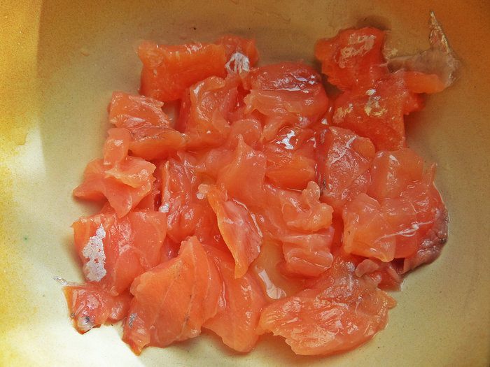 Нужен кусочек обжаренной или малосольный, или копченой рыбки.