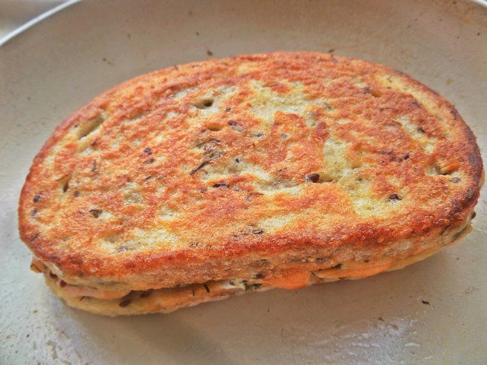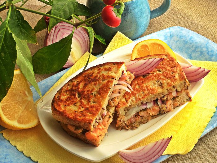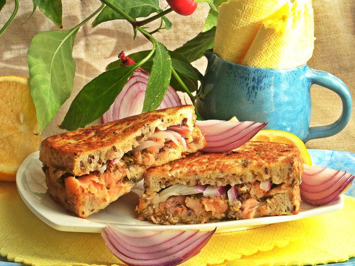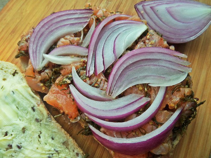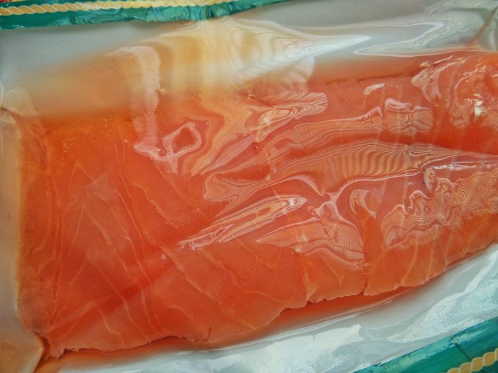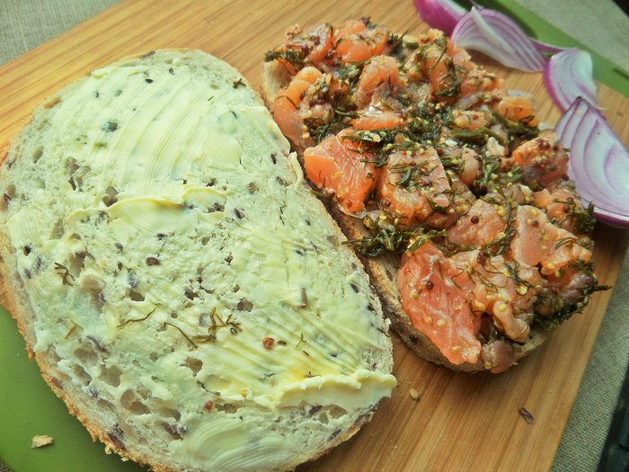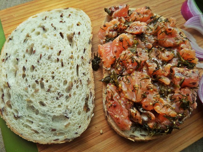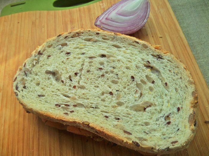 На хлеб положить рыбную нарезку. Хлеб у меня с семечками.