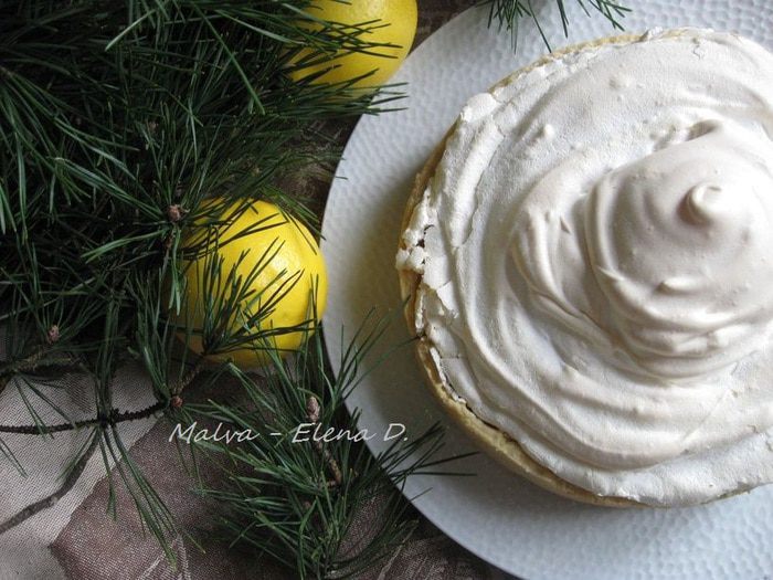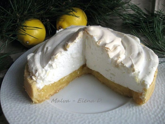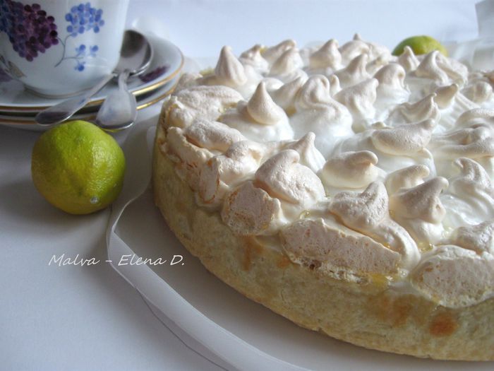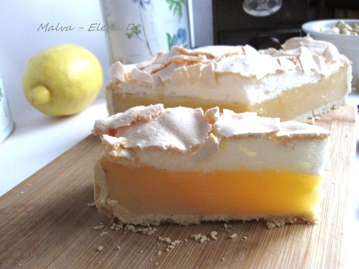 Это еще один вариант — одна из моих попыток на пути к своему рецепту. Здесь сделаны неправильные, экспериментальные шаги (слишком большое время запекания меренги, видите: трещины, но верхний слой, похожий на хрустящее миндальное пирожное, очень вкусный), курд приготовлен по приведенному выше рецепту, как мне кажется, удался).