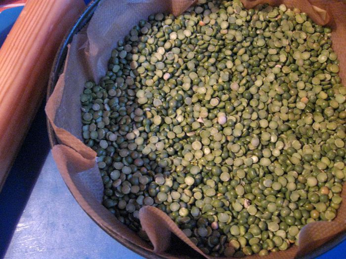 Духовку разогреть до 180°С. Выложить горох (фасоль) на основу для теста, предварительно закрыв ее бумагой для выпечки. Поместить в духовку минут на 15 — 20. Вынуть из духовки, убрать горох и бумагу сверху теста.