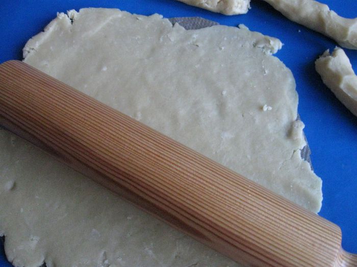 Достать тесто из холодильника. Отделить часть теста для бортиков. Основу я раскатываю на бумаге для выпечки, вырезанной по размеру дна формы, тесто вместе с бумагой потом кладу на дно формы.