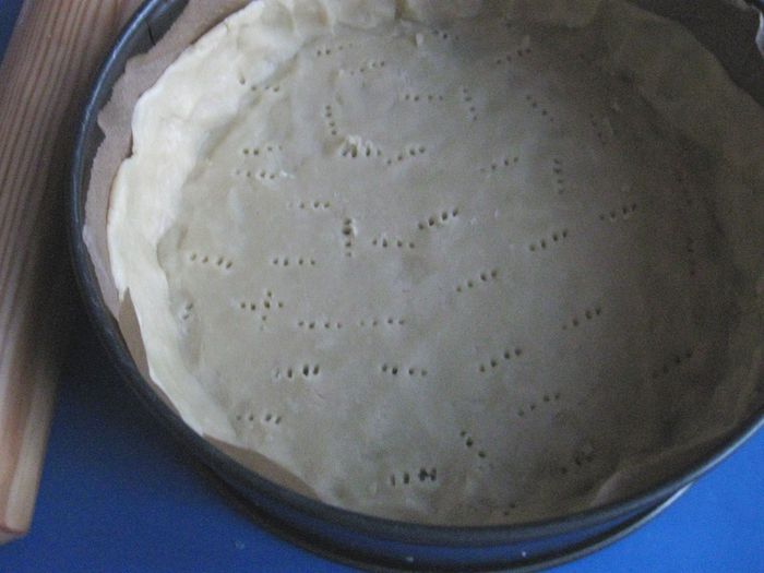 Борта формы также закрыть бумагой для выпечки. Сформировать бортики из теста. Основу из теста наколоть вилкой. Убрать основу в холодильник на 10 — 15 минут.