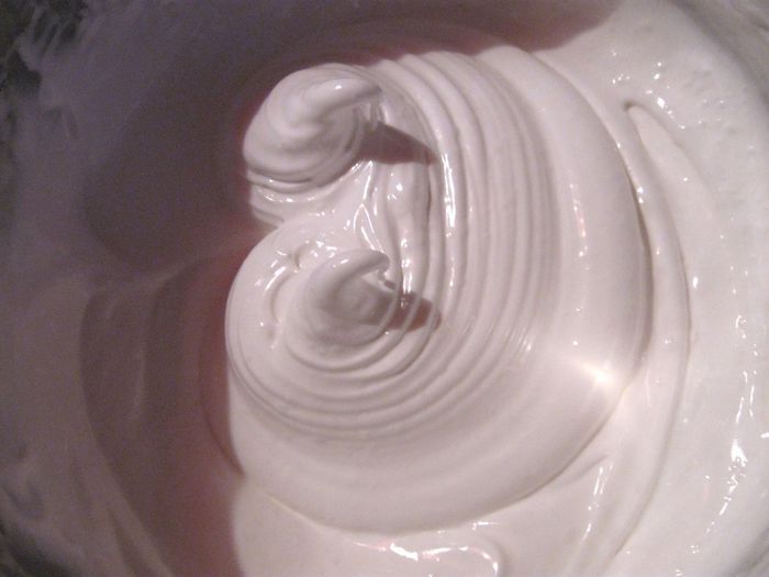 Взять миску с белками. Важно, чтобы желток не попал в миску, иначе меренги не взобьются. Чем больше будет миска для взбивания белков, тем лучше, так как в массу при взбивании попадает больше воздуха, соответственно воздушнее, нежнее и больше получится меренга. Белки взбить миксером до пиков, постепенно добавляя сахарную пудру (не переставая взбивать). Это поможет смеси оставаться очень густой. Холодный белок взбивается быстрее, имеет плотную структуру, при нагревании быстрее теряет форму, чем взбитые белки комнатной температуры.