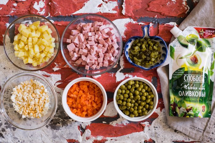 Подготовьте овощи: картофель, морковь тщательно вымойте и отварите в мундире, охладите и затем очистите. Яйца отварите вкрутую. У горошка слейте всю жидкость.