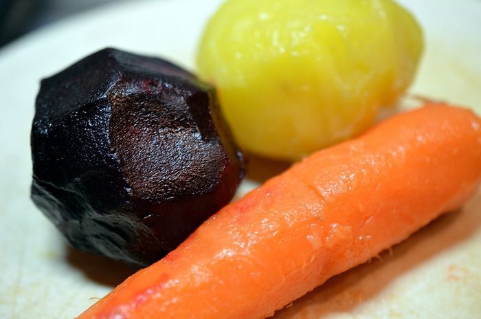 Овощи отварить и почистить.