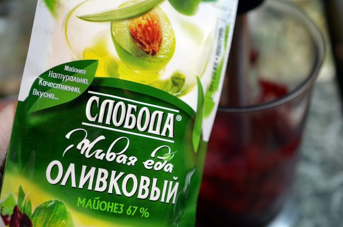 Добавить майонез и еще раз пюрировать. Для этого блюда я взяла Оливковый майонез ТМ «Слобода». Он не содержит крахмал и ГМО, прошел органик-контроль и сделан из натуральных ингредиентов.