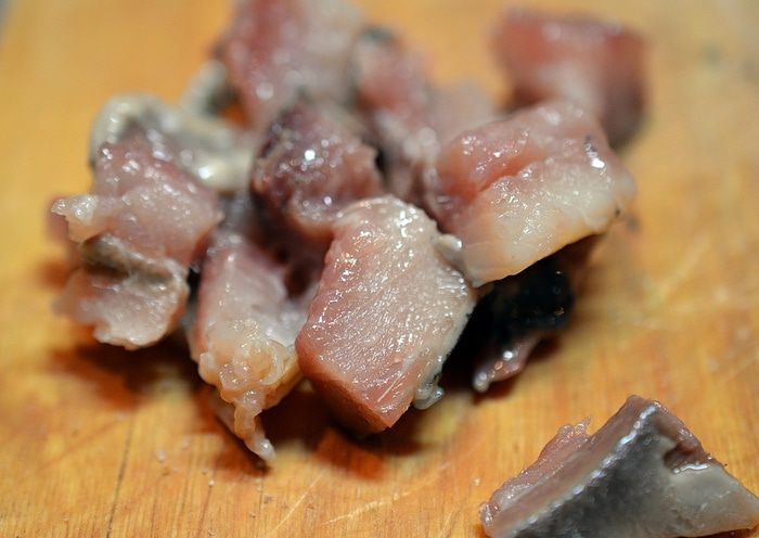 Сельдь разделать и нарезать на маленькие кусочки.
