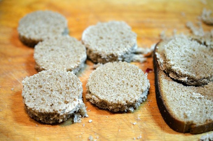 Из хлеба вырезать кружки с помощью рюмки.