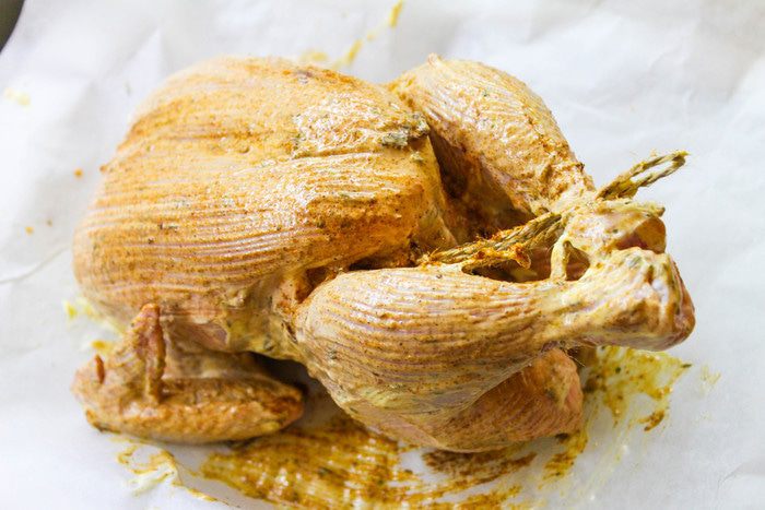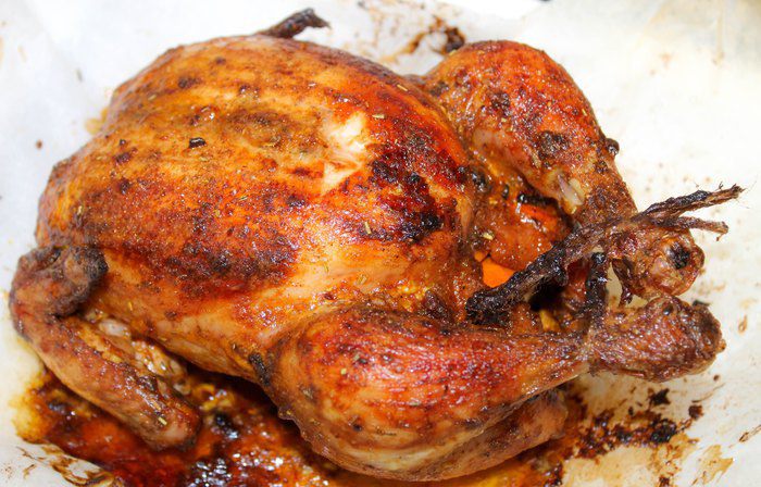 Три мандарина сорта бэйби (сладкие), разрезать пополам, начинить курочку. Духовой шкаф прогреть до 180 — 190°С, противень застелить пергаментом, выложить курочку и запекать примерно 1 час, иногда поливая вытопившимся соком. Через 30 минут приготовления и за 5 минут до окончания запекания, поливать соком половинки мандарина.